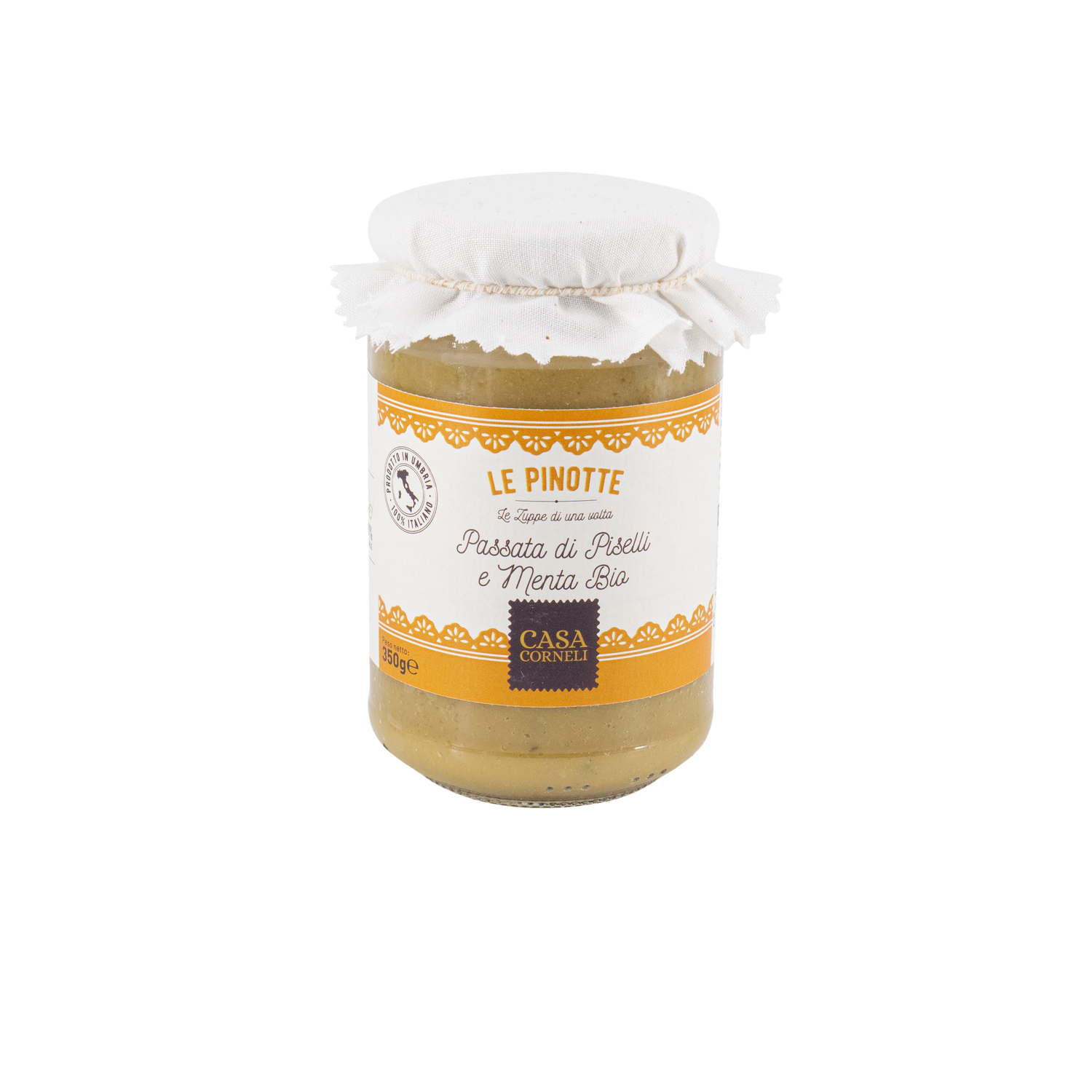 Ingredienti: piselli lessati (65%), cipolla, acqua, olio extravergine di oliva, sale, menta (1%).