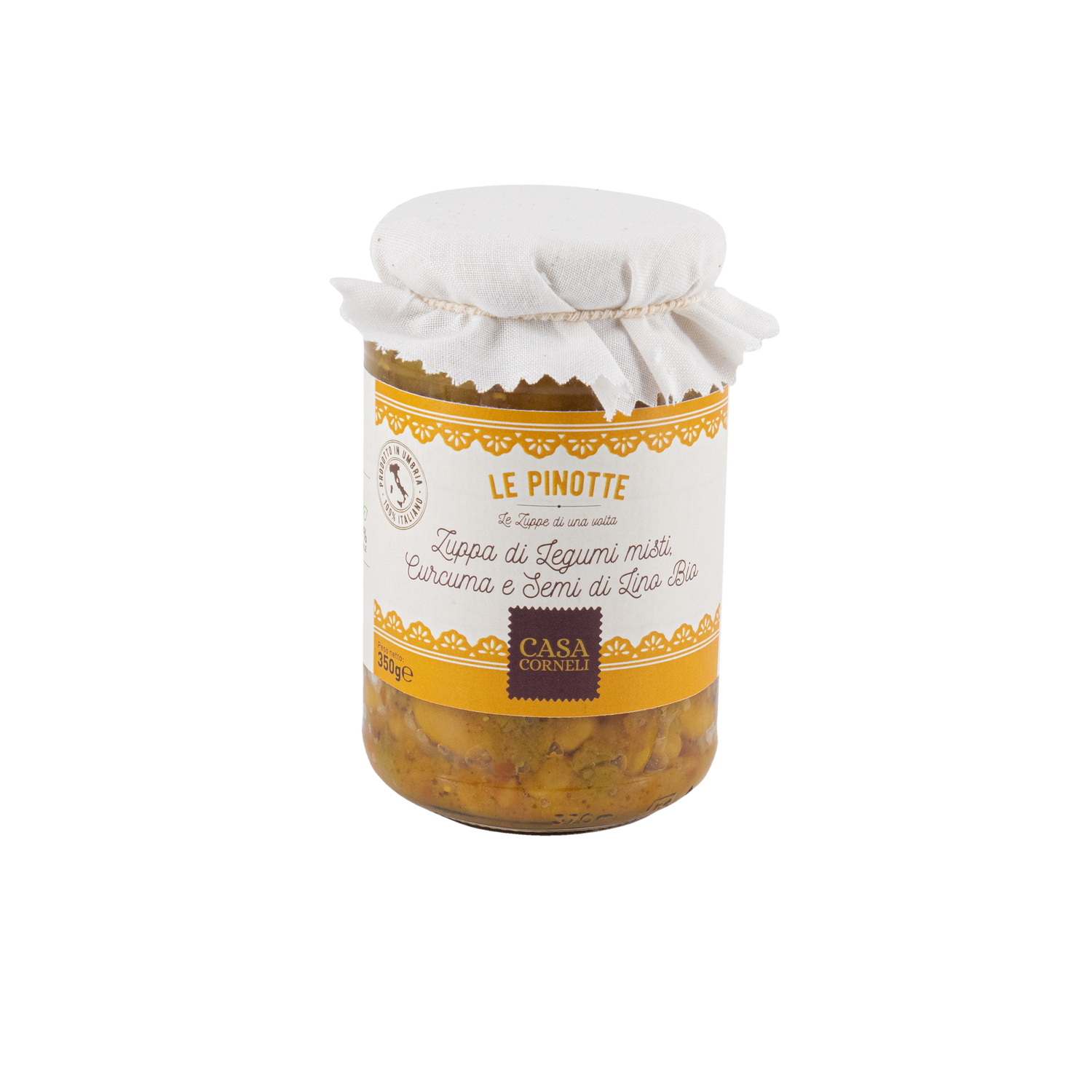 Ingredienti: ceci lessati*, piselli lessati, lenticchie lessate, acqua, cannellini lessati, borlotti lessati, cipolla, sale, curcuma (NON UE) (1%), semi di lino (1%), olio extravergine di oliva.